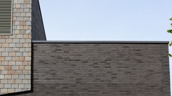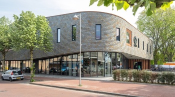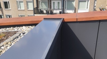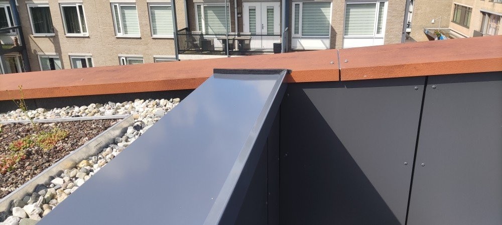 Das Dach ist mit Aluminium- Mauerabdeckungen abgeschlossen. Die Detaillierung des Gebäudes ist raffiniert, was gut zur Wahl der Aluminium-Detaillierung passt. Eine bewusste Wahl, betont Keeris: „Wir wollten scharfe Linien, eine starke Profilierung und Material, das schön bleibt ohne Aufwand. Aluminium ist dann eigentlich selbstverständlich, es ist außerdem formbar.“ Die Aluminium- Mauerabdeckungen schließen nahtlos an das architektonische Bild der Kei an. Sie folgen den schrägen Linien des Gebäudes und sorgen für einen ruhigen Abschluss der Fassaden. Die Maßanfertigung in Aluminium war entscheidend bei der Ausführung der runden Formen und der scharfen Ecken. „Gerade beim Theaterteil und dem Eingang haben wir den Handwerkern das Äußerste abverlangt. Dann ist es gut, wenn man mit Materialien arbeitet, die sich biegen, ohne an Qualität einzubüßen.“