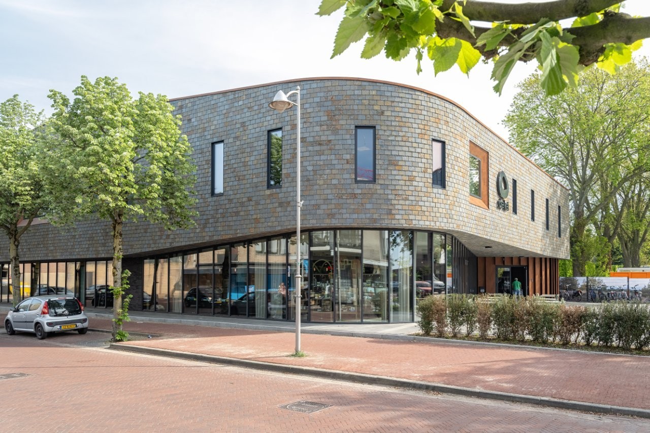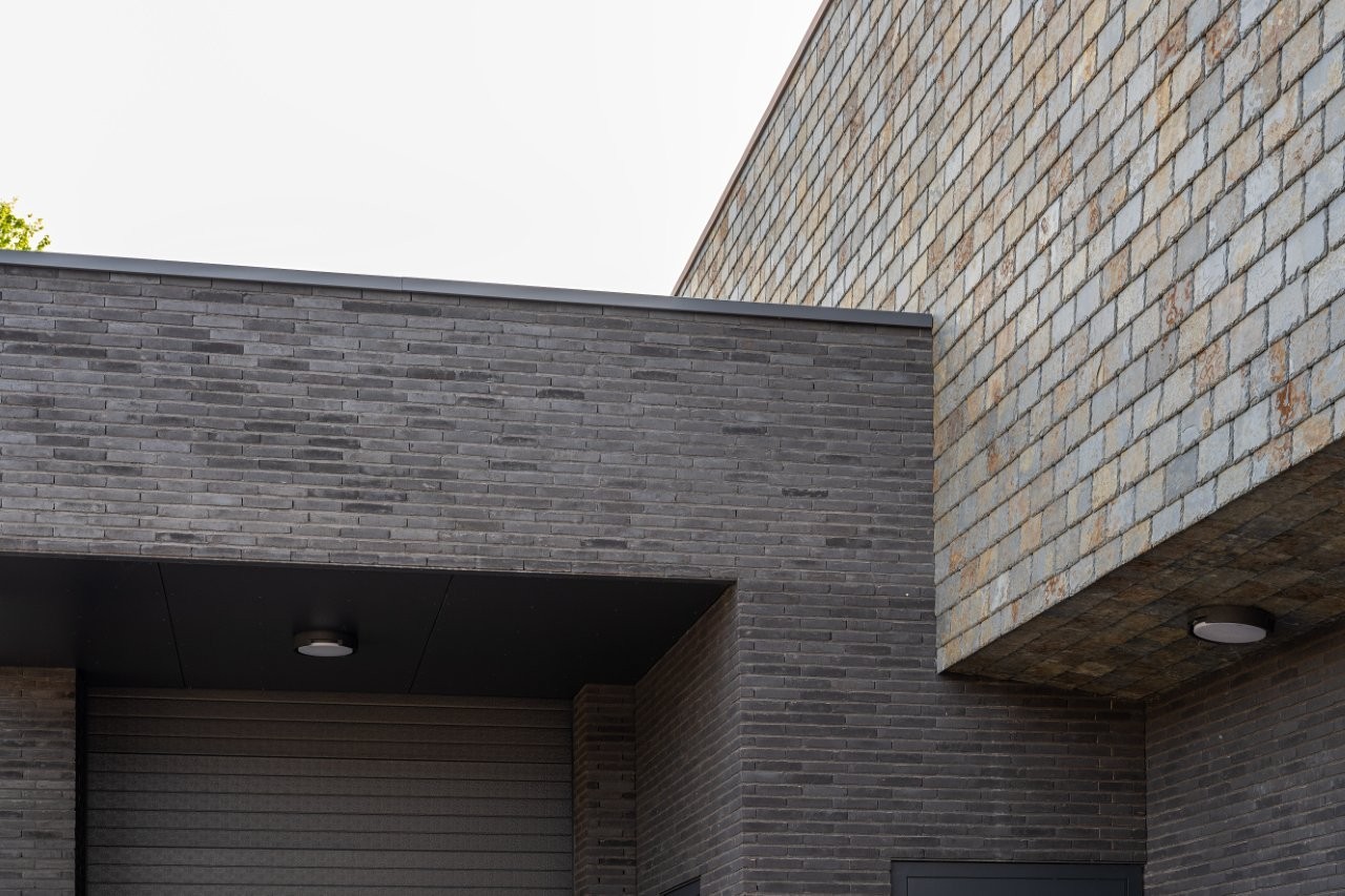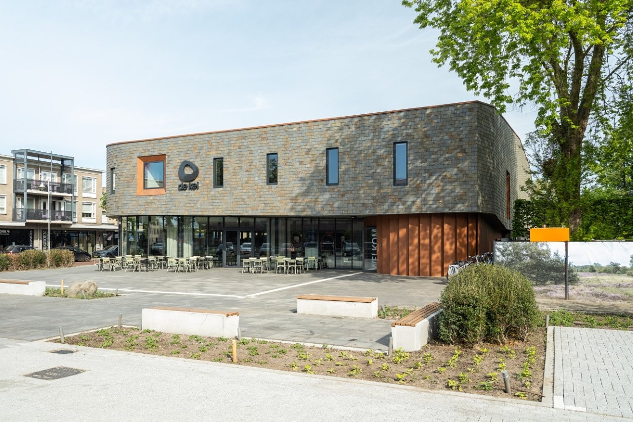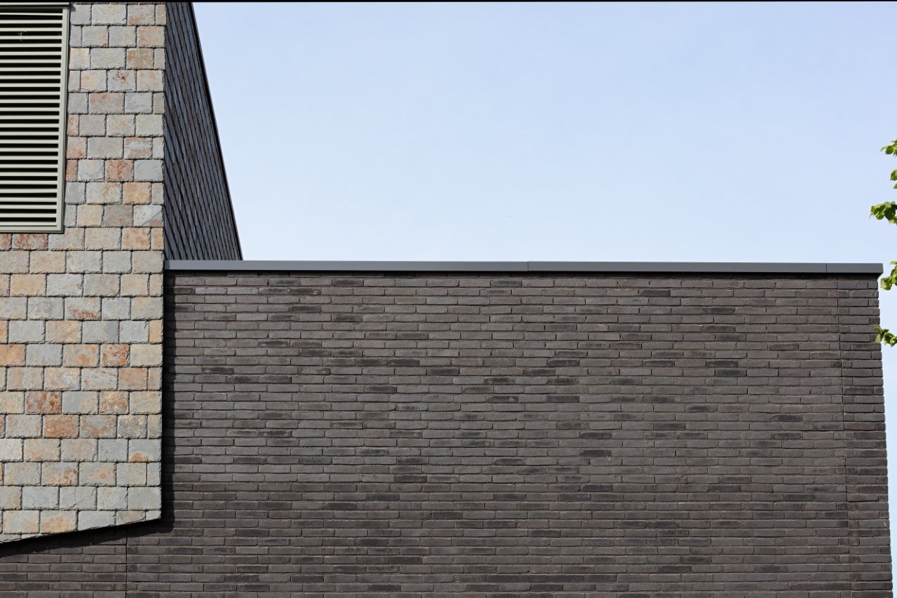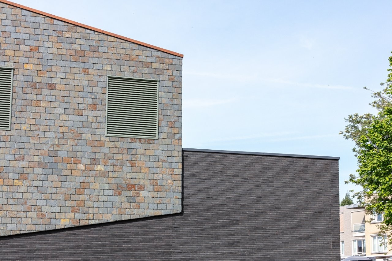 Die alte Kei musste ersetzt werden. Veraltet, wenig Komfort und eine unpraktische Wegeführung. Dennoch hing Emotion daran, besonders bei den älteren Einwohnern von Reusel. Die Herausforderung für Keeris lag darin, etwas Neues zu bauen, das sich vertraut anfühlt, aber den Anforderungen dieser Zeit entspricht. „Wir wollten ein Gebäude, das Substanz hat. Keine anonyme Kiste, sondern eine charakteristische Kei, die den Platz umarmt. Robust und gleichzeitig zugänglich.“ Der Standort, mitten im Dorfzentrum, erforderte eine Geste. Nicht aufdringlich, sondern selbstbewusst. Die transparente Sockelzone am Kirchplatz sorgt dafür, dass das Gebäude „mit dem Platz atmet“. „Das Foyer öffnet sich zur Umgebung. Man sieht, was drinnen passiert. Es lädt ein.“ Das Obergeschoss ist geschlossen, massiv. Ausgeführt in Schiefer, in dunklen Tönen, die an das Kambrium erinnern. Genau wie der echte Findling aus dem Wald.