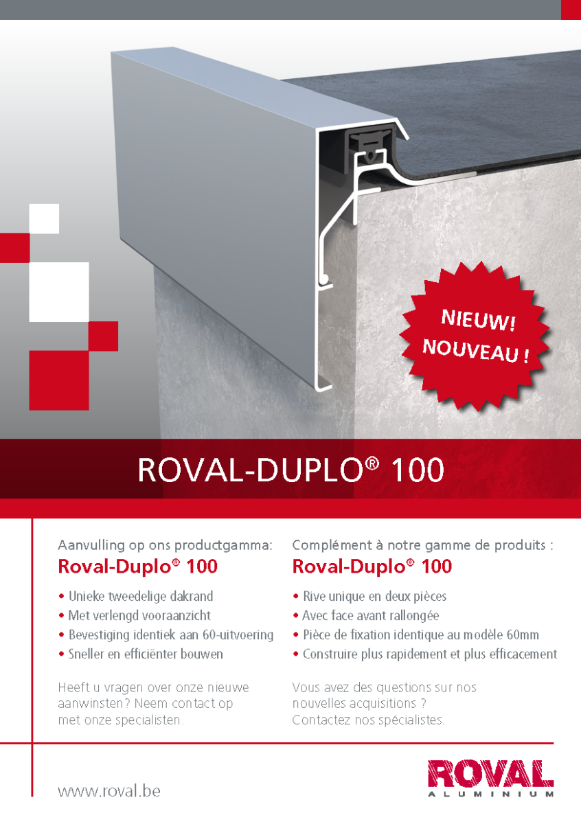 Roval Aluminium breidt het programma aluminium dakranden uit met de Roval-Duplo® 100. Daarmee heeft de Duplo-serie een variant met een grotere afdekking naast de inmiddels veel toegepaste Roval-Duplo® 60. Opdrachtgevers vragen steeds vaker om grotere afdekmaten. Met 60 én 100 mm kies je per detail precies de afdekking die nodig is, zonder een ander systeem te hoeven toepassen.