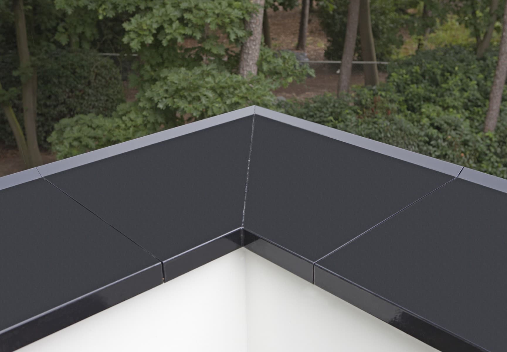 Die strakke detaillering komt ook tot uiting in de materiaalkeuze, waarbij Suurland nadrukkelijk rekening heeft gehouden met de transparantie van de woning. Zo is de villa voorzien van aluminium puien, die uiterst rank zijn geprofileerd. Suurland: “Dat is toch een groot voordeel van het vormbare aluminium. Ook op diverse andere locaties heb ik gekozen voor aluminium. Zo zijn de borstwering van de toegang naar de garage, de dakrand, de schoorsteenbekleding, de borstwering op de dakterrassen en de entreepoort voorzien van aluminium muurafdekkappen. Een bewuste keuze. Een betonnen afwerking wordt groen, hout vergt veel onderhoud in tegenstelling tot het onderhoudsarme aluminium en met aluminium kun je zeer strak detailleren. Bovendien sluit het wit en zwart gepoedercoat aluminium uitstekend aan op het witte stucwerk. Ook voor het louvredak in overstek aan de zuidkant van de woning heb ik gekozen voor beweegbare aluminium lamellen. Datzelfde geldt voor de diverse geveldeuren en voor de kozijnen met raampartijen die zich diep in de neg bevinden. Ook hier zijn aluminium waterslagen toegepast.”