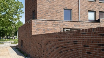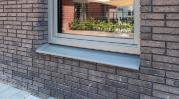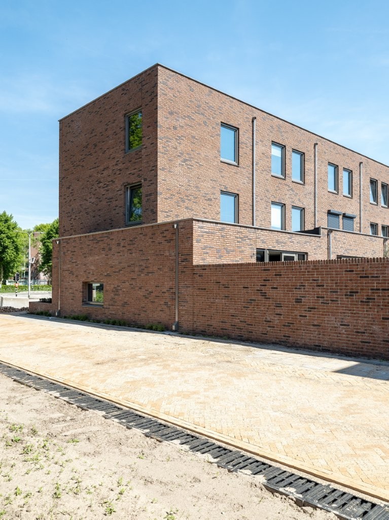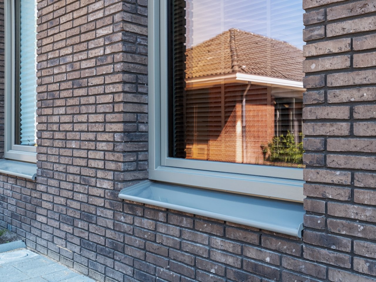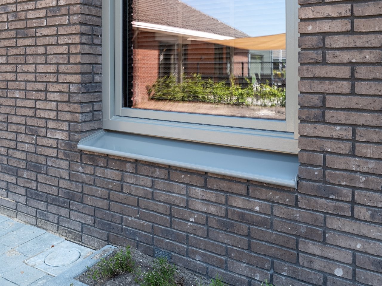 De woningen in het Willemskwartier kenmerken zich door een ingetogen architectuur. Metselwerk is het dominante materiaal, waar houten kozijnen in een warme, rustige kleur in zijn opgenomen. “Die kozijnkleur – kwartsgrijs – zie je terug in de aluminium waterslagen, dakranden, muurafdekkappen en hemelwaterafvoerbekledingen. Zo ontstaat rust en ritme. Ondanks afwisseling in gevelkleur, is de kleur kwartsgrijs overal in doorgetrokken. Daarbij speelt aluminium een belangrijke rol. We wilden slanke, abstracte detaillering die past bij de ingetogen uitstraling. Aluminium is dan een logische keuze. Het is duurzaam, onderhoudsarm en het laat zich strak verwerken. We hebben onder andere gekozen voor aluminium detaillering die subtiel in het gevelvlak is opgenomen.” Opvallend detail: bij de schuine daken is in voorkomende gevallen gekozen voor aluminium dakranden met een ronde kraal. “Zo vloeien de daklijnen van schuine en platte daken mooi in elkaar over. Het geeft het geheel een zekere organische structuur en herkenbaarheid, zonder schreeuwerig te zijn.”
